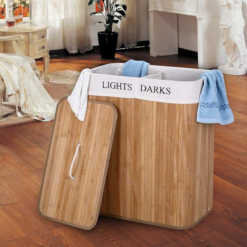 Bambu kirli sepeti, iki bölmeli tasarımıyla pratik bir çözüm sunar.