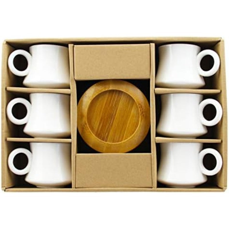 Altı adet porselen fincan ve altları bambu malzemeden yapılmış altlıklar.