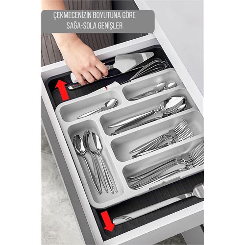 EŞSİZ FlexForm TASARIMI : Çift taraflı uzayabilen kaşıklık, çekmecelerinizi derleyip toparlamakla kalmayacak aynı zamanda şık bir görünüm sağlayacaktır. Her çekmeceye uygundur. Uzayabilen yapısı sayesinde ufak çekmece veya büyük çekmece içlerine göre ayarlanabilir. İstenildiği takdirde uzayan bölümü çıkartılıp sadece kaşıklık tarafıda kullanılabilir.