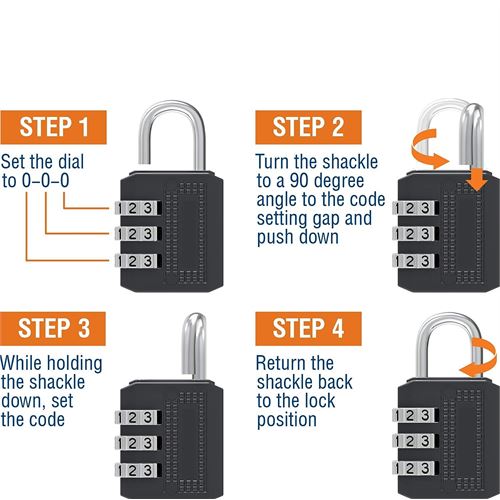 KOLAY AYAR ANAHTARSIZ KADRAN: 4 adımlı kolay ayar, önce kilidi açın, kelepçeye basın ve saat yönünün tersine 90° döndürün, kelepçenin altındaki küçük kancayı deliğe sokun, tutmak için saat yönünün tersine 45° daha döndürün, yenisini ayarlayın kombinasyon. Bu anahtarsız kilide sahip olduktan sonra anahtarı kaybetme konusunda asla endişelenmeyin.